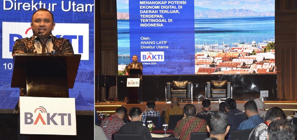 Direktur Utama BAKTI Kominfo, Anang Latif memberikan sambutan pada seminar tentang potensi ekonomi digital di daerah terdepan, terluar dan tertinggal (3T) di Indonesia, yang berlangsung di The Energy Building, Jakarta, Selasa (10/3/2020)