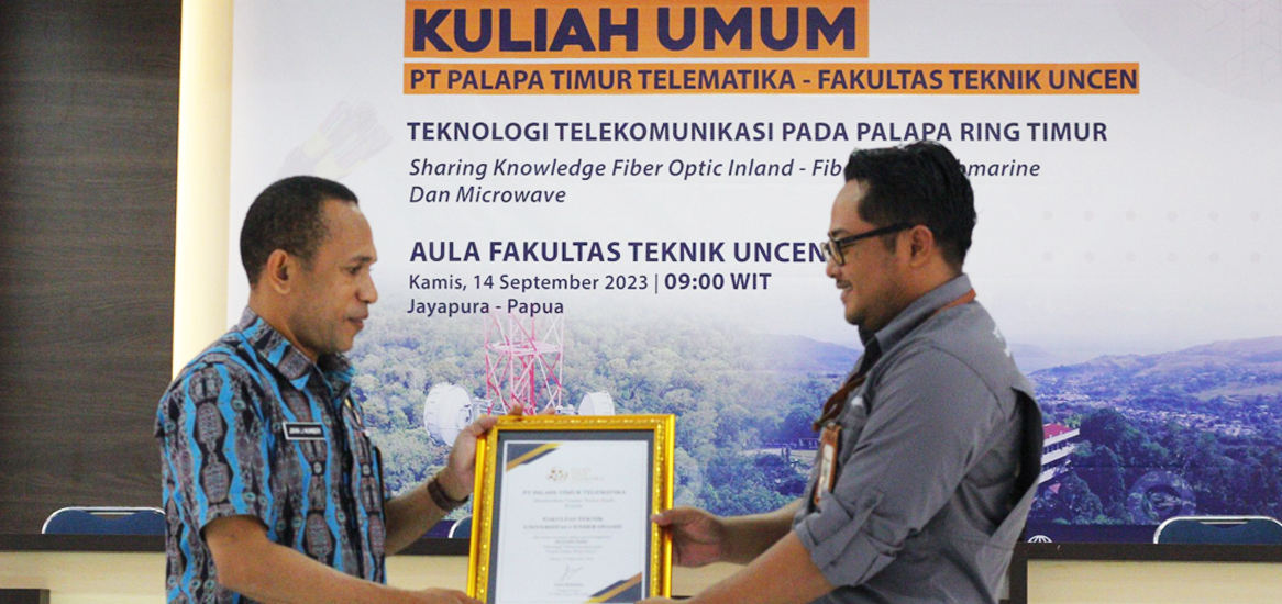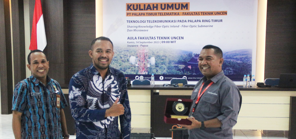 Kamis, 14 September 2023 - PT Palapa Timur Telematika mendapat kehormatan diundang secara khusus oleh Fakultas Teknik - Universitas Cenderawasih di Jayapura guna memberikan materi kuliah umum seputar teknologi fiber optic Palapa Ring Timur bagi para Mahasiswa baru FT UNCEN. Kegiatan kuliah umum ini dibuka langsung oleh sambutan dekan Dr. Ir. Johni Jonatan Numberi, M.Eng, IPM dengan dihadiri para dosen dari FT UNCEN. Materi kuliah ini dibawakan langsung oleh Parlin Marbun - Area Manager Sorong tentang